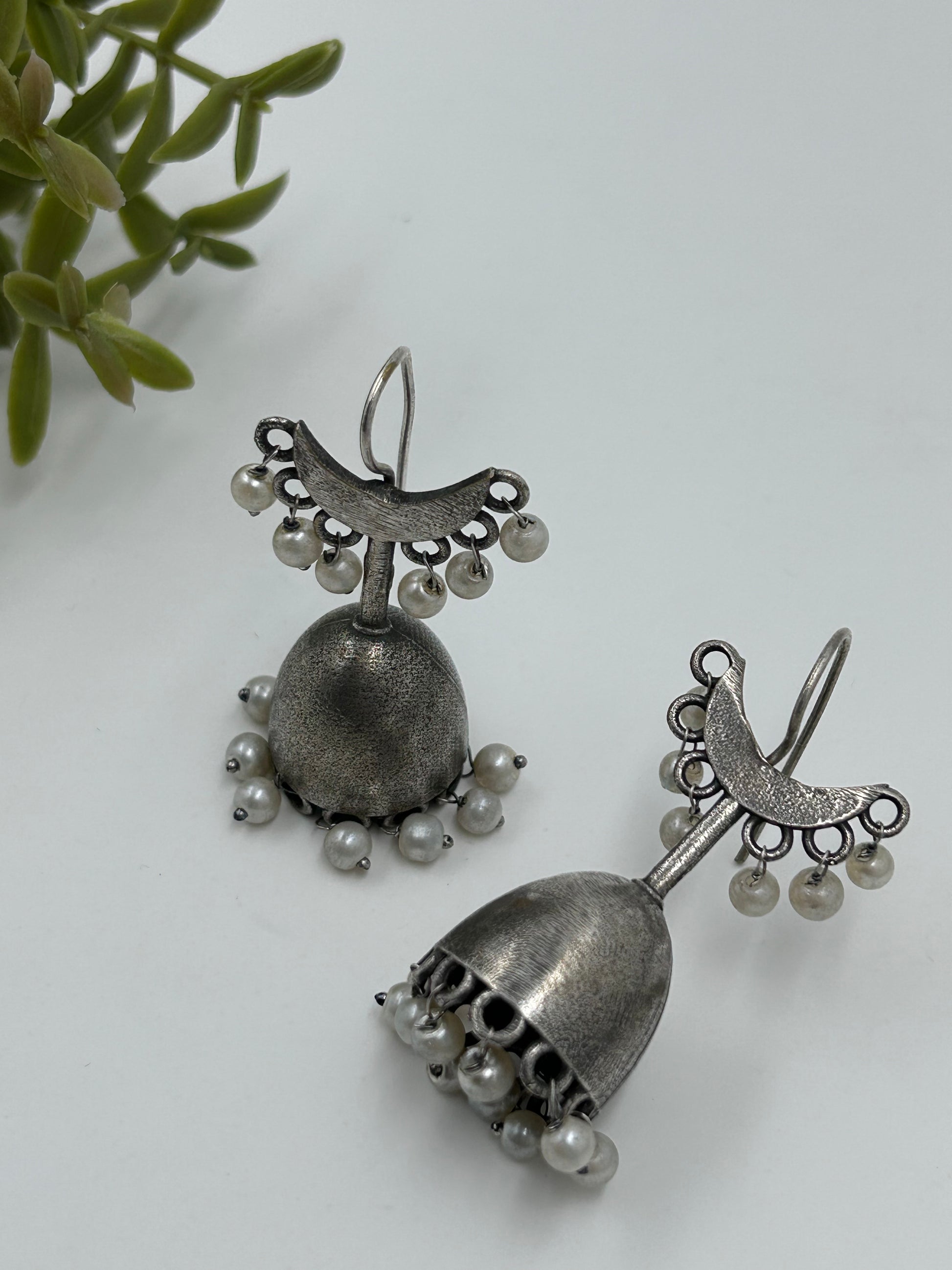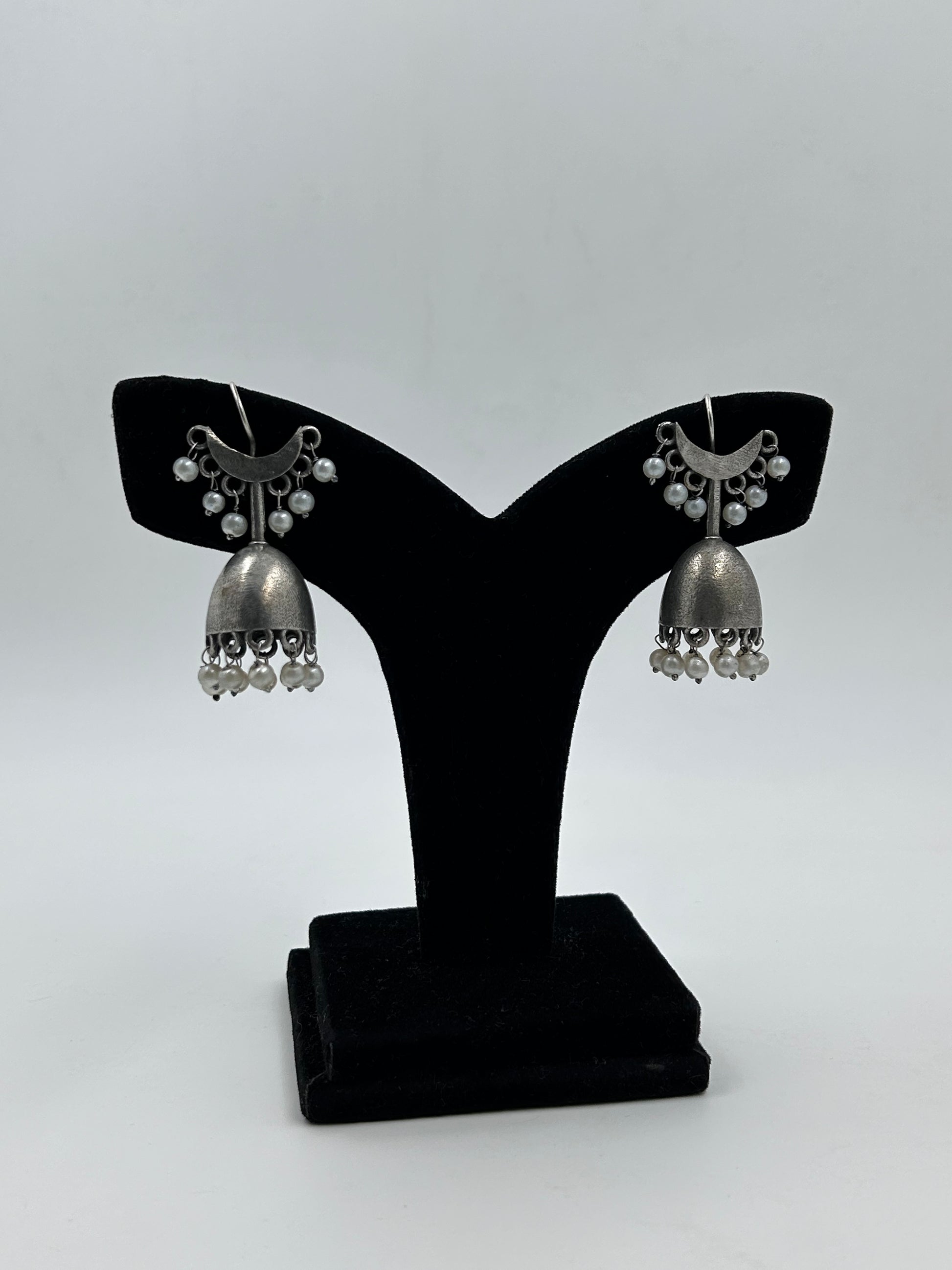 This Chandi Silver lookalike Jhumka Bugatti combines intricate silver detailing with elegant pearl drops. Its timeless design makes it perfect for both special occasions and everyday charm.