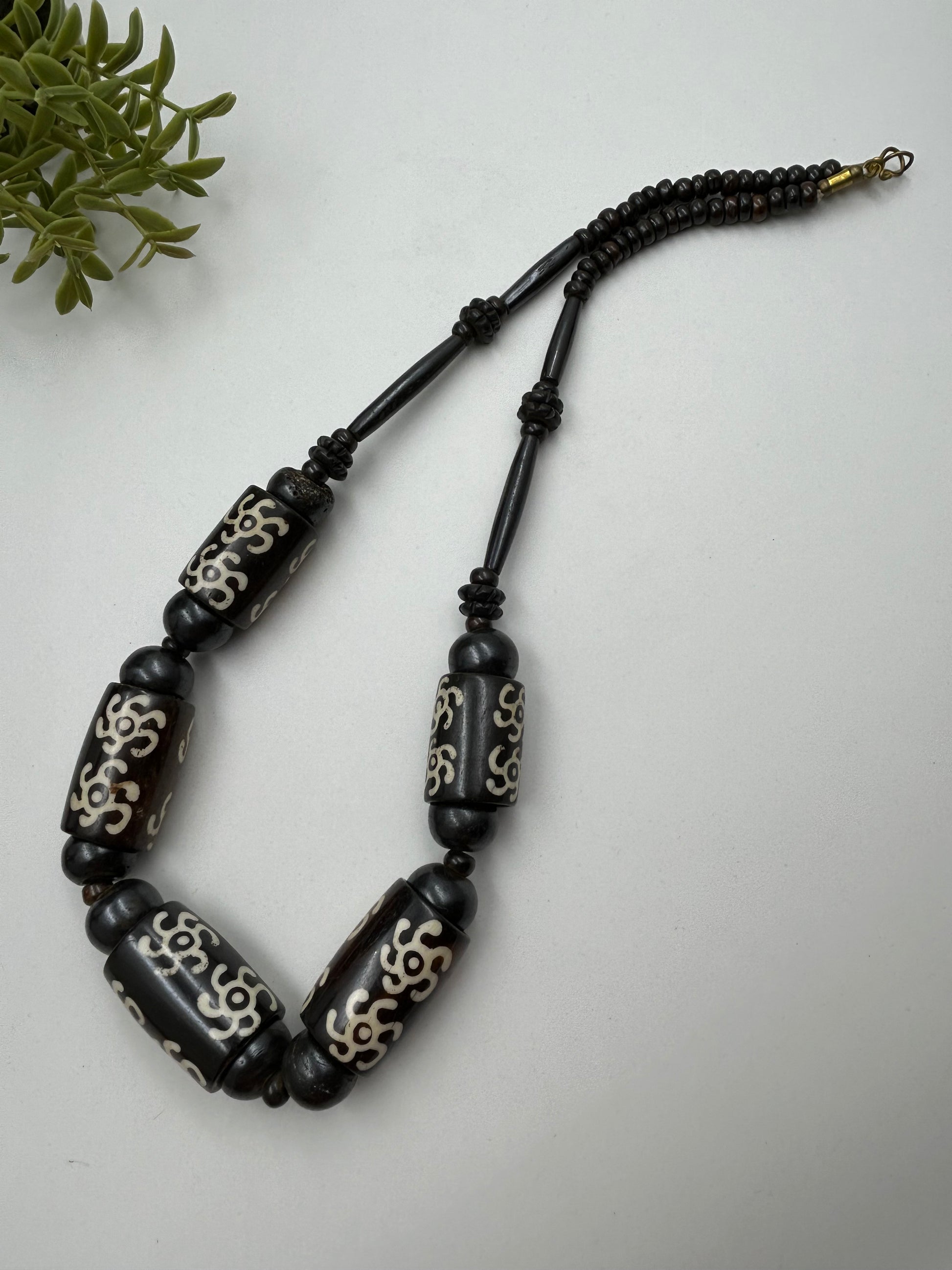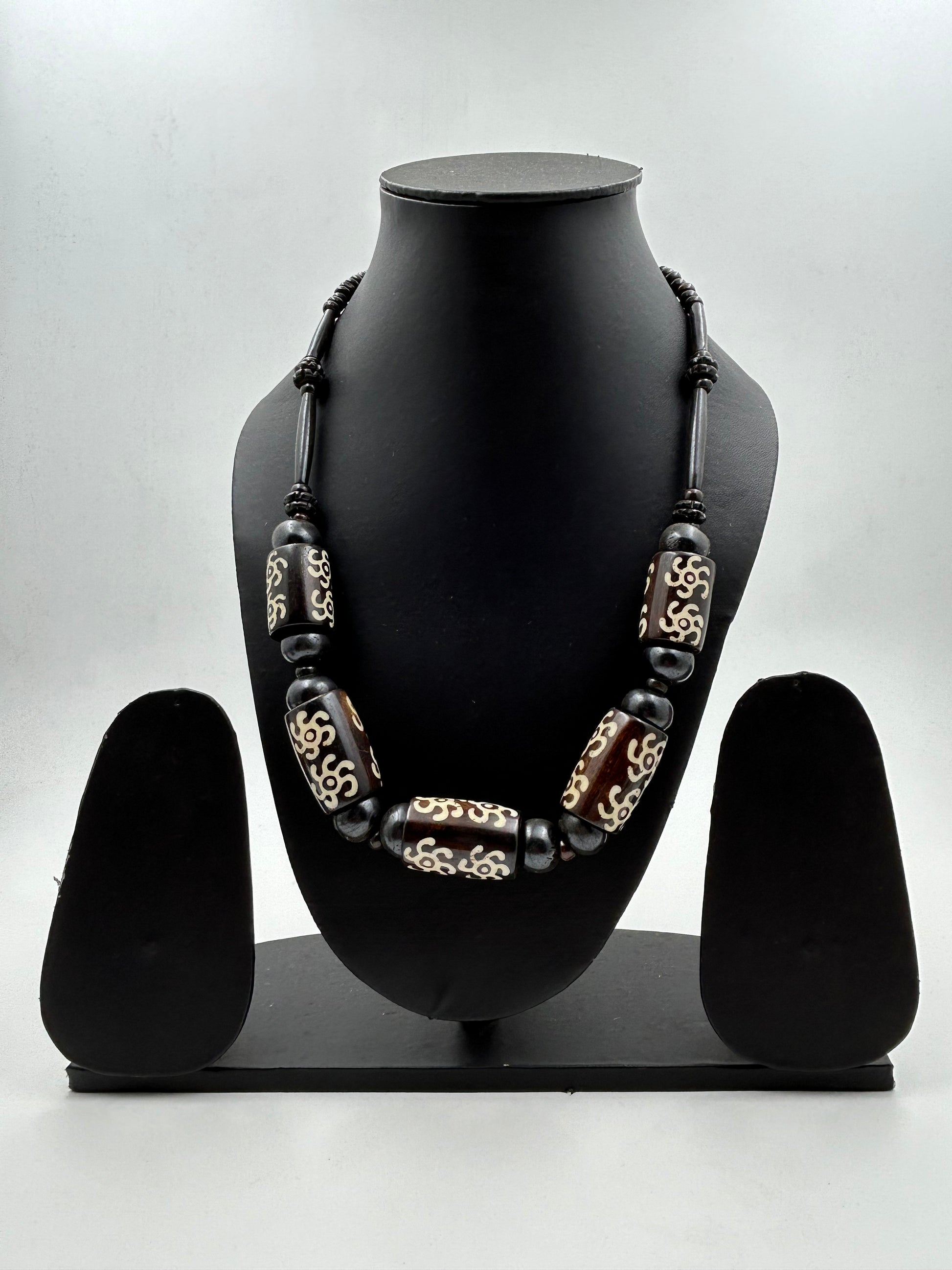 This earthy-toned necklace is crafted with rustic brown beads featuring a bone-inspired look. The beads carry contrasting floral motifs, giving them a tribal yet artistic charm. The design reflects raw elegance, making it a versatile piece for both traditional and fusion wear.
