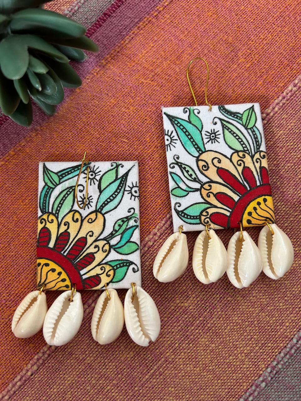 Rectangular white base fabric earrings handpainted with colorful flowers and leaves, bringing a fresh and lively feel. Finished with natural cowries as hangings, these earrings are cheerful, earthy, and full of handmade charm.
