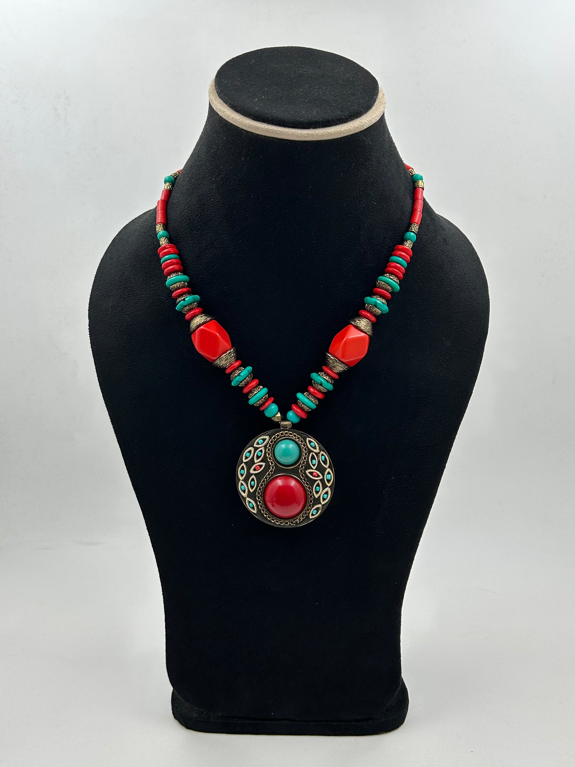 A stunning Tibetan-style necklace in a red and sea green combination, crafted with a brass-based round pendant. The intricate detailing in red and green beautifully frames the centerpiece, which features red and green stones at the center. The bold red dominance makes it a striking accessory for festive and traditional looks.