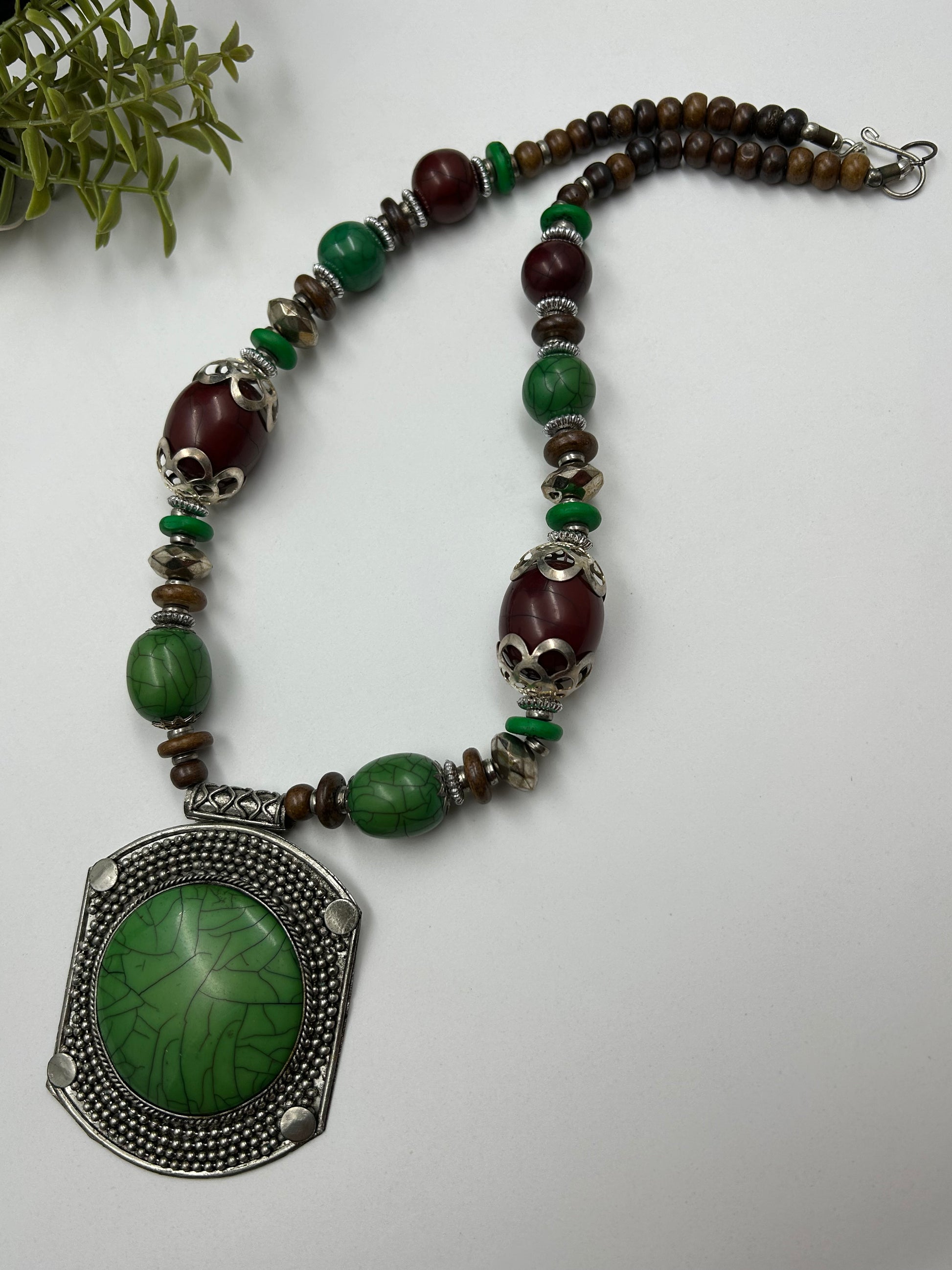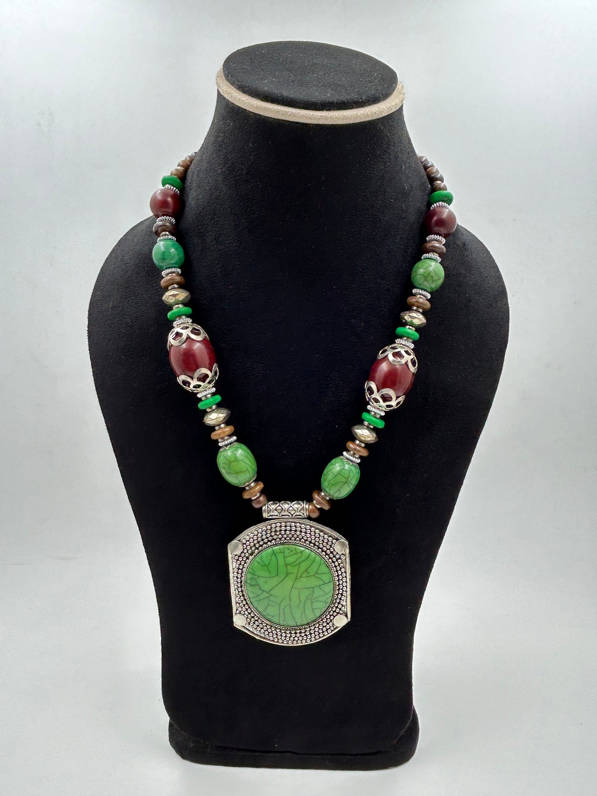 An earthy Tibetan necklace in green and brown featuring a bold green stone set on an oxidised silver base. The subtle color blend makes it versatile and elegant, a perfect choice for understated yet stylish ethnic looks.